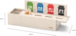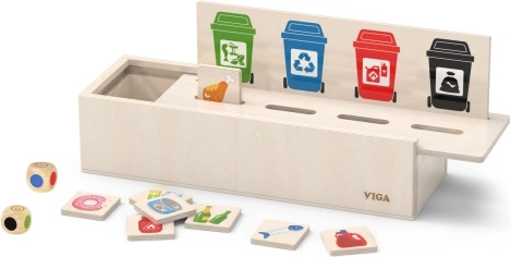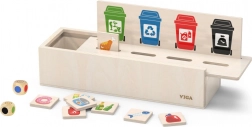 Denne lærende VIGA-lege fra træ er ideel til børn, der lærer grundlæggende affaldssortering. Den leveres med en trækasse med huller til at indsætte brikkerne og en tavle med forskellige skraldespande. Den inkluderer også 50 træbrikker med billeder af affald og farver, der svarer til genbrugskategorier.