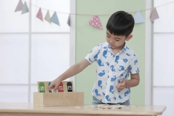 Legetøjet lærer børn korrekt affaldssortering ved hjælp af legende træbrikker og farvekodede skraldespande.