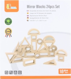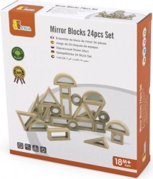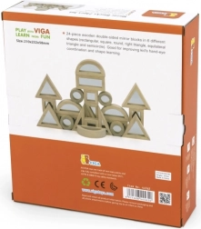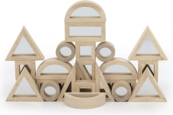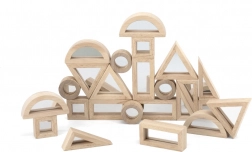 Sættet indeholder 24 dobbeltsidede træklodser med spejle, som hjælper børn med at udvikle hånd-øje-koordination og genkendelse af forskellige former. I pakken finder du seks forskellige former, herunder rektangler, firkanter, runde, retvinklede trekanter, ligesidede trekanter og halvcirkler. Takket være spejlene udvikler børn også en følelse af eget “jeg”, hvilket øger deres selvtillid.