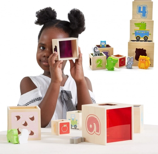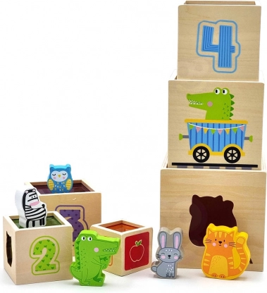 Dette fantastiske sæt indeholder seks klodser i forskellige størrelser, hver med sine egne motiver. Børn lærer at skelne mellem tal, former, farver, størrelser og dyr. Klodserne kan nemt placeres i hinanden eller stables oven på hinanden, hvilket hjælper børn med at forstå begreberne orden og rækkefølge.