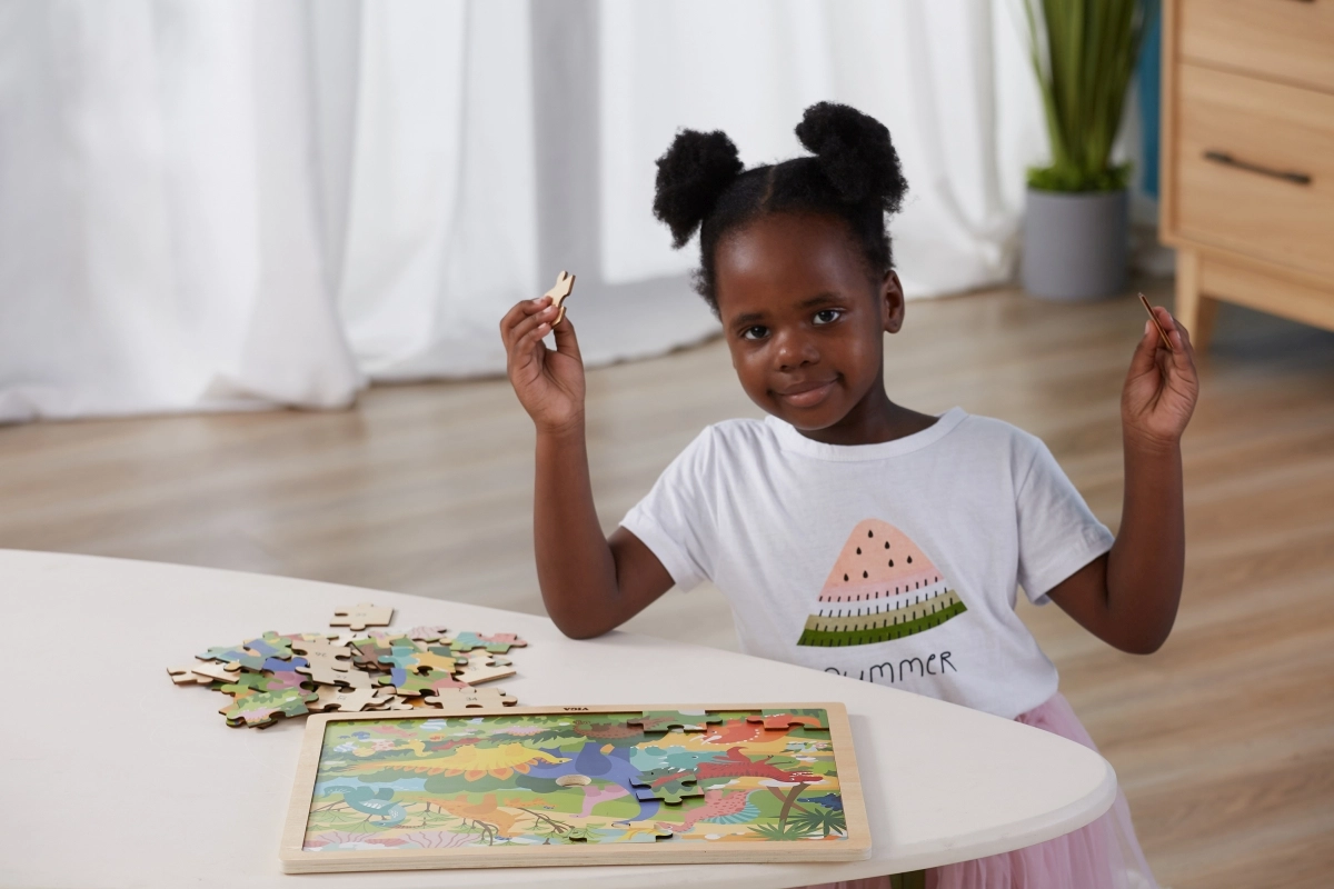 Det robuste træunderlag holder brikkerne på plads, gør det nemt at bære og opbevare og hjælper børn med at fokusere på at lægge motivet.