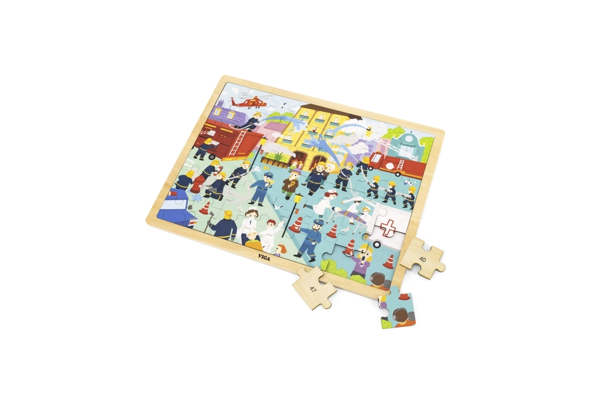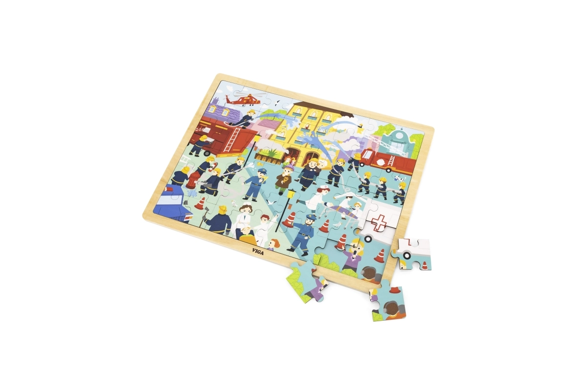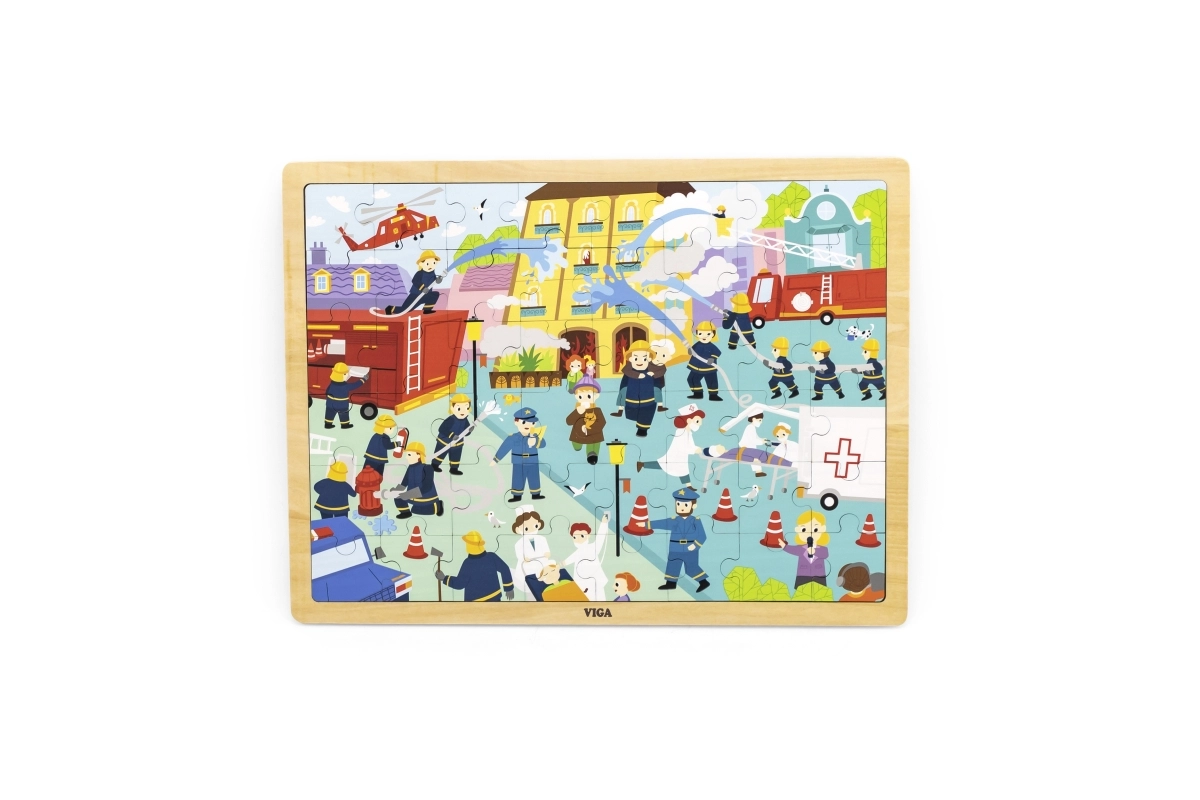 Dette kvalitets træpuslespil med et farverigt billede af brandmænd er perfekt til de første puslespilsoplevelser og til at udvikle børnehavebørns færdigheder. Brikkerne er solide, behagelige at holde om og samles i et stabilt træunderlag, som gør håndtering og opbevaring nemmere.