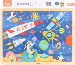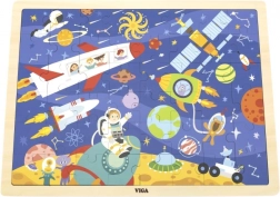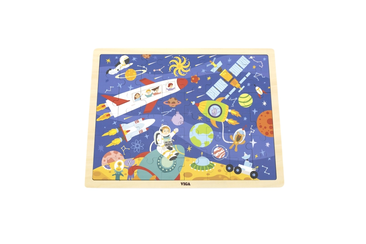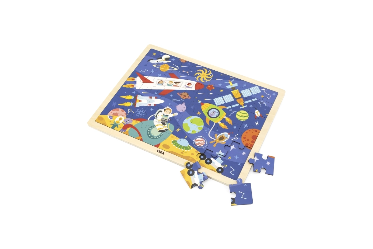 Dette kvalitets træpuslespil med 48 brikker giver børn et medrivende eventyr i rummet. De farverige illustrationer af planeter, raketter og astronauter fastholder opmærksomheden og stimulerer den naturlige nysgerrighed. Puslespillet ligger i en solid træramme, som gør det nemt at samle og transportere.