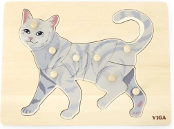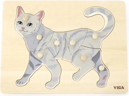Barnets opgave er at samle kattemotivet ikke kun efter illustrationen, men også efter de enkelte brikkers form. Knopgrebene gør det nemt for små fingre at gribe og støtter korrekt håndføring. Den solide træplade holder brikkerne sikkert på plads og tåler daglig brug.
