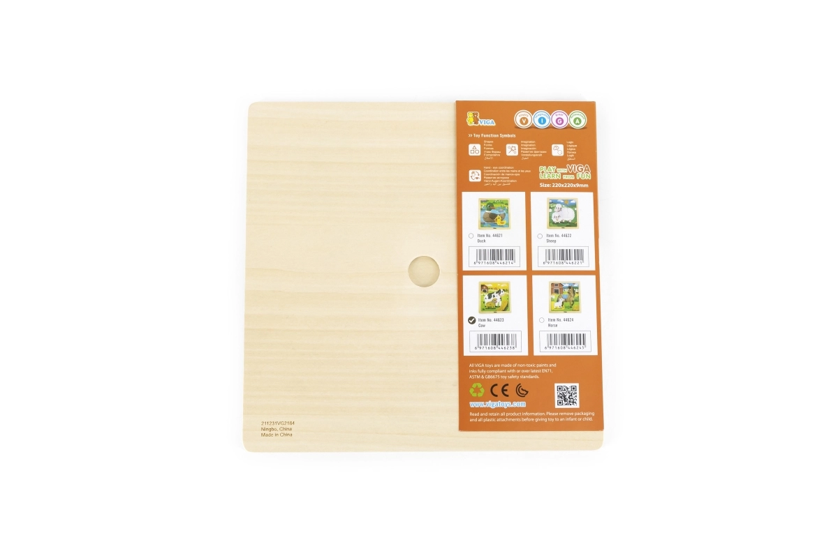 Træpuslespil med 9 brikker og et billede af køer. Træpladens mål ca. 22 x 22 x 1 cm. Pakkens mål ca. 22 x 22 x 1 cm. Alder 18 m+