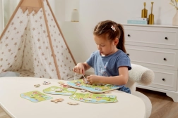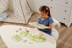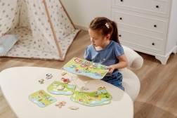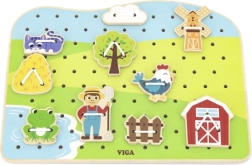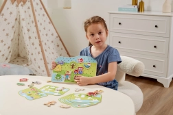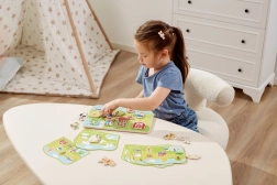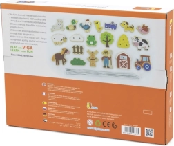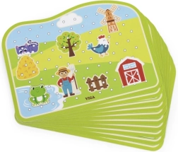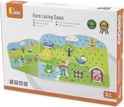 Dette snøresæt med gårdtema er et ideelt redskab til at udvikle færdigheder hos førskolebørn. Børn trækker snore gennem farvede træbrikker efter forlæg eller egen fantasi, hvilket styrker fingrene, forbedrer grebet og forbereder dem på at skrive og tegne.