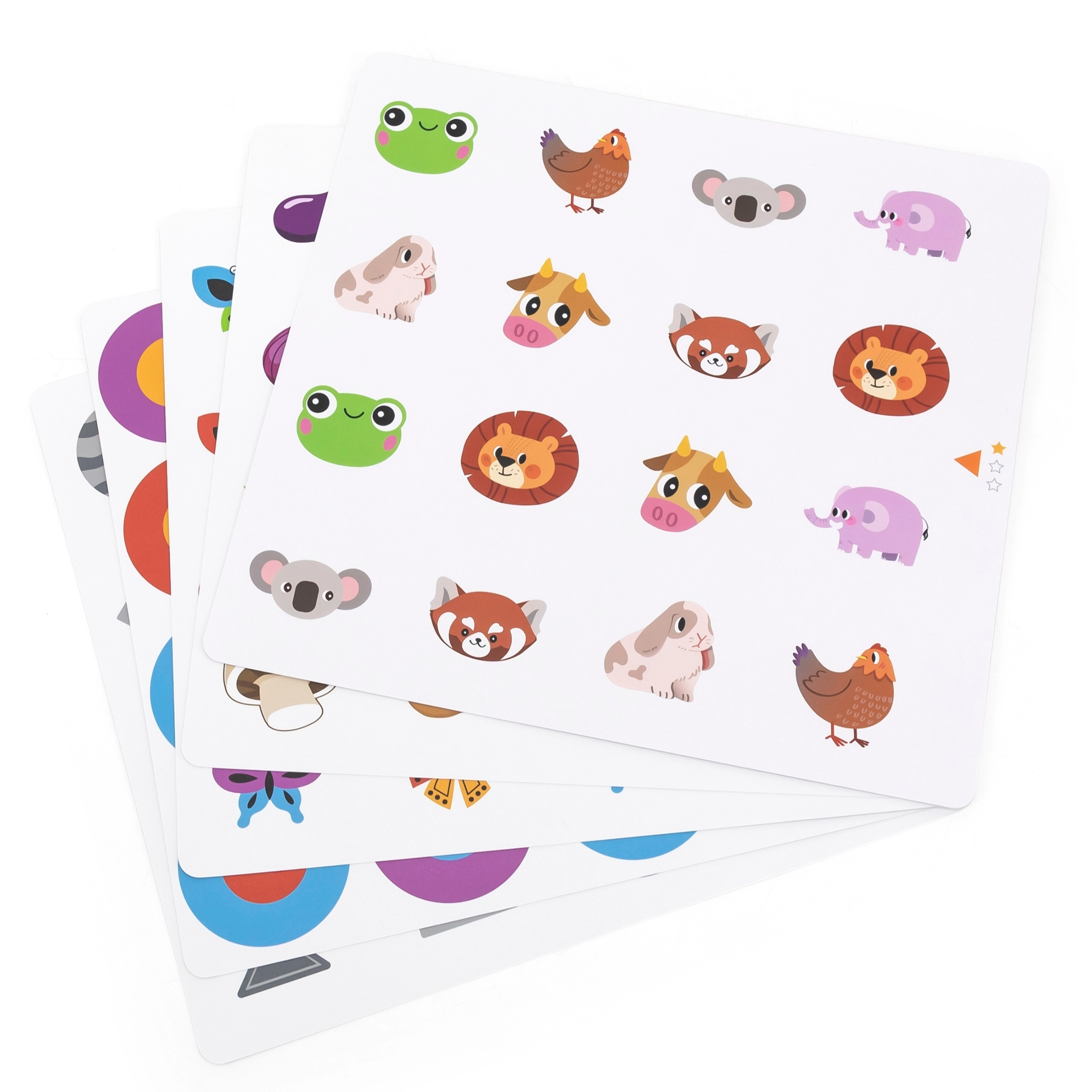 Der medfølger 10 dobbeltsidede kort med varierede motiver (dyr, genstande, planter). Du kan nemt skifte dem og tilpasse temaer og sværhedsgrad til barnets alder.