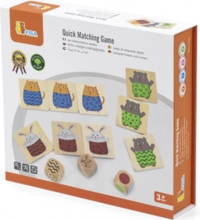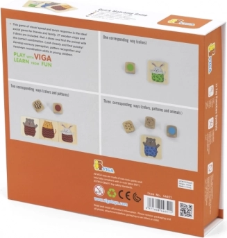 Træspil hurtig parring fra mærket VIGA er et familieselskabsspil, der træner opmærksomhed, logik og hukommelse. Spillerne kaster 1–3 terninger og finder det rigtige dyr med matchende mønster på trøjen og farve. Fremstillet af kvalitetstræ og malet med ikke‑giftige farver – sikkert for børn.