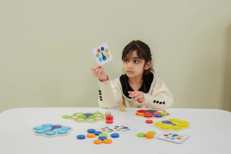 Børn matcher skiver efter kort eller terningekast, tilegner sig naturligt farver og træner opmærksomhed og logik.