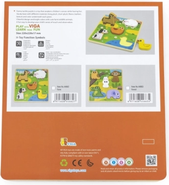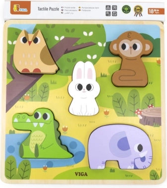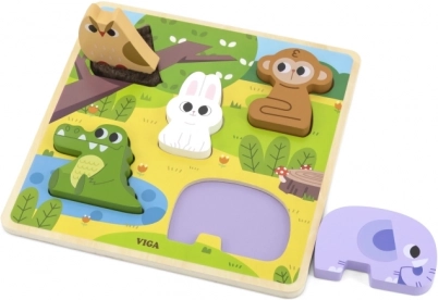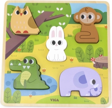 VIGAs træindsætspuslespil med skovdyr er det ideelle første puslespil til de mindste. Opgaven er korrekt at matche dyrefigurer til de markerede huller på den farvede base. Delene ligger godt i de små hænder, og den robuste trækonstruktion sikrer lang levetid.