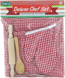 Komplet børne-køkkensæt til små kokke fra 5 år indeholder alt nødvendigt til den første madlavning og bagning. Du finder i sættet et forklæde, en grydelap, en kagerulle i træ (ca. 20,5 cm), en træskee (ca. 14,5 cm) og et piskeris i metal (ca. 12,5 cm). Ideelt til at udvikle finmotorik, kreativitet og sikker leg i køkkenet.