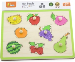 Farverigt træpuslespil med frugtmotiver til børn fra 18 måneder, der udvikler finmotorik, genkendelse af former og farver samt øje–hånd-koordination. Takket være træknopper er brikkerne lette at holde og sætte på plads – ideelt til de første logiske lege.