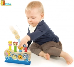 Den stabile træbase i form af et skib og fire træpinde med dyrefigurer (giraf, abe, løve, zebra) skaber et sikkert og holdbart legeområde. Den flotte emballage gør det til en ideel gave til småbørn og børnehavebørn.