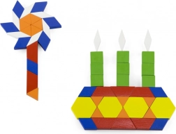 Det store antal flade træblokke i forskellige former og farver stimulerer fantasien og udvikler rumlig forestillingsevne. Børn kan lægge mønstre, dyr og hele billeder.