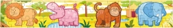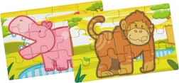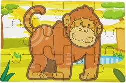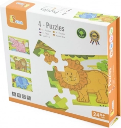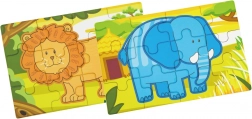 Dette sæt træpuslespil med glade jungledyr vil glæde ethvert barn. Hvert motiv har klare farver og enkle former, som gør det nemt at lægge og stimulerer barnets fantasi. Af brikkerne kan man samle både fire separate billeder og et langt panoramamotiv med alle dyrene.