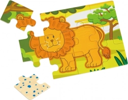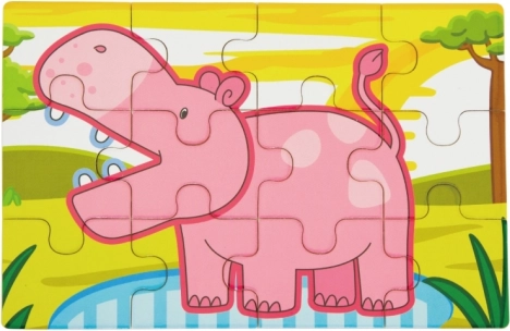 Enkle former og klare farver på løve, elefant, flodhest og abe motiverer børn til at lægge puslespil og styrker det visuelle fokus.