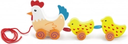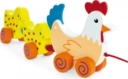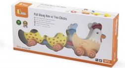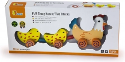 Dette træ-træk-legetøj forbinder en høne og to kyllinger med en rød snor. Mellem kyllingerne er der farvede perler, som under bevægelse fanger både barnets syn og hørelse. Når legetøjet trækkes, vugger den glade “familie” sødt og motiverer børn til at gå.
