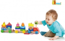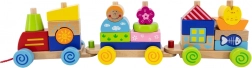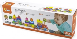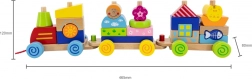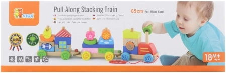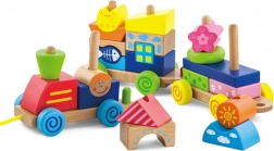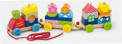 Dette kvalitets træ-træklokomotiv med tre vogne giver masser af muligheder for at stable og ombygge farvede former. Børn kan træne øje-hånd-koordination, lære farver og former at kende og samtidig nyde sjov ved at trække toget rundt i hjemmet.
