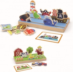 Dette sjove og lærerige puslespil hjælper børn med at forstå rumlige relationer og fremmer deres kognitive udvikling. Børn kan arrangere forskellige scener på en lagdelt plade, der tilbyder både bondegårds- og hav-eventyr.