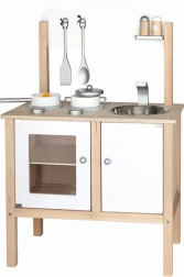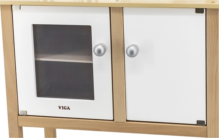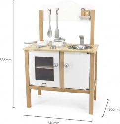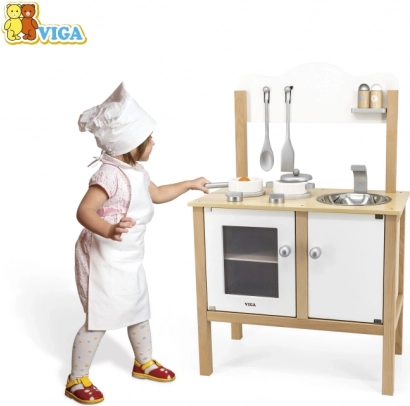 Vigas trælegetøjskøkken er ideelt til små kokke, der vil efterligne madlavning. Denne trækonstruktion i moderne hvid og naturtræ er både robust og stilfuld og passer ind i ethvert børneværelse.
