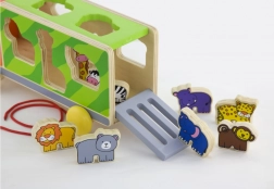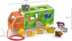 Lastbilen kan trækkes i snoren og fungerer samtidig som en smart puttekasse. Børn bruger både bevægelse og logik, når de finder de rigtige huller til dyrene.