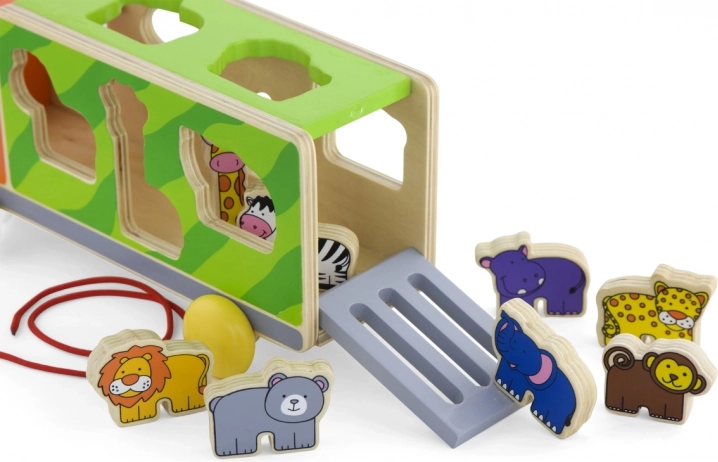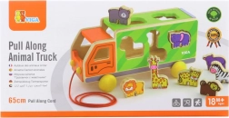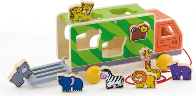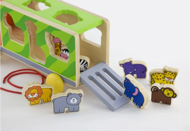 Denne farverige trælastebil kombinerer træklegetøj og puttekasse 2-i-1. Børn trækker lastbilen i snoren og lægger samtidig dyrene i de matchende huller, hvilket træner tålmodighed, logik og fingerfærdighed. De glat forarbejdede kanter og den robuste udførelse er som skabt til daglig leg.