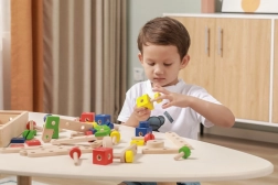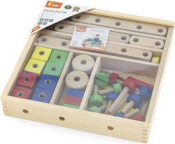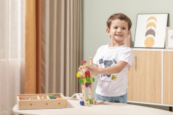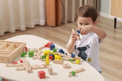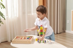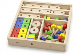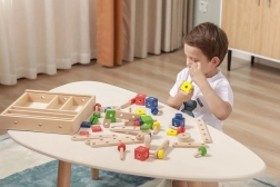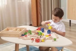 Byggesættet udvikler finmotorik, hånd-øje-koordination samt logisk og rumlig tænkning. Naturligt træ kombineret med klare farver indbyder til leg og læring gennem sjov. Alt er pænt organiseret i en boks med gennemsigtigt låg, så delene er lette at rydde op og altid er lige ved hånden.