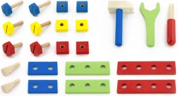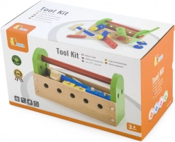 Dette kvalitetsværktøjssæt i træ i en robust transportkasse er ideelt til de første byggeforsøg. Børn træner finmotorik, logisk tænkning og øje–hånd-koordination ved at skrue, hamre og spænde. De farvede dele og realistiske værktøjer stimulerer kreativ og rolleleg.