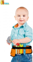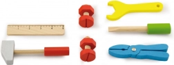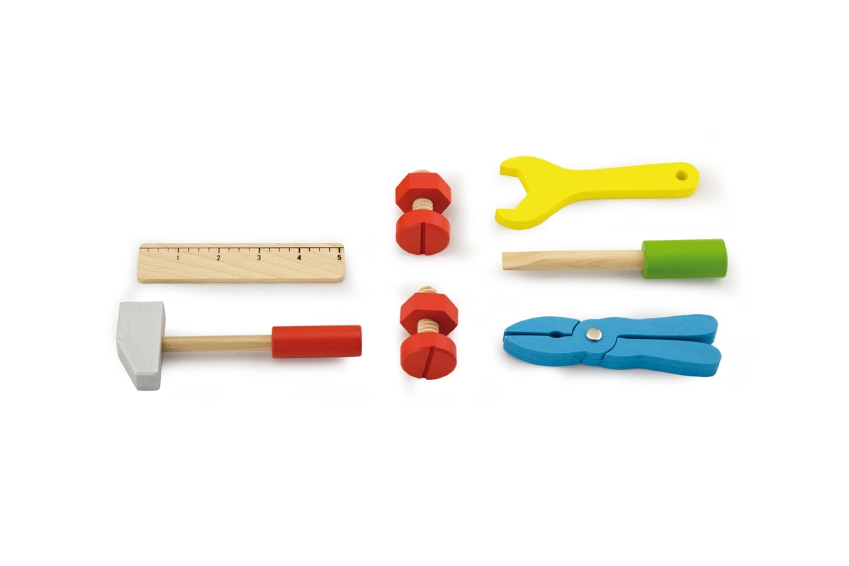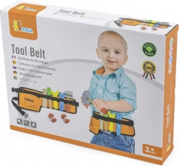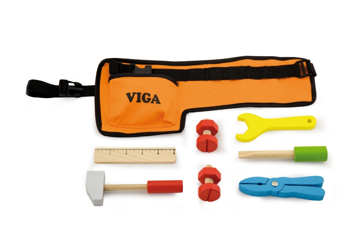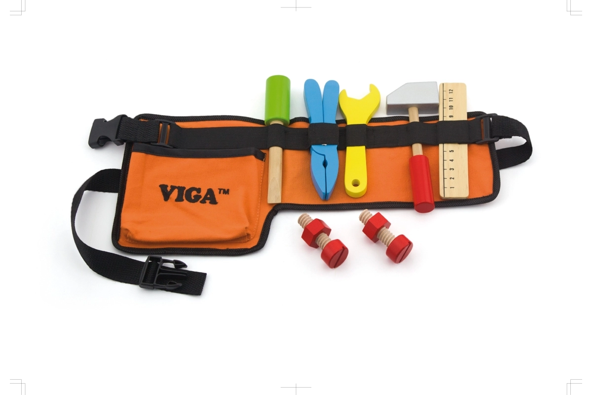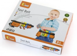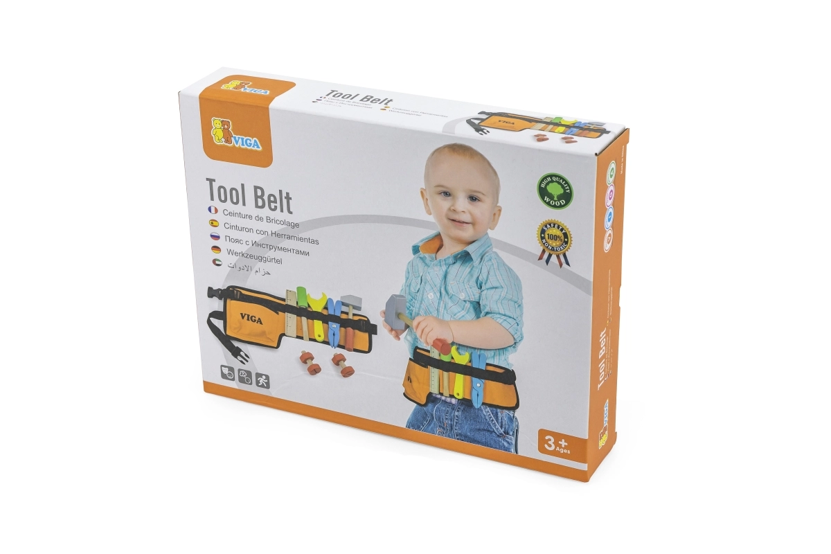 Bælte med træværktøj (indeholder hammer, nøgle, skruetrækker, målebånd, skruer og møtrikker, tang). Bæltets mål ca. 36 x 18 x 2,5 cm. Emballagens mål ca. 27 x 21 x 5 cm. Alder 3+