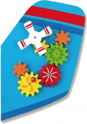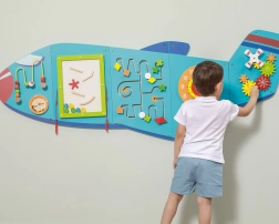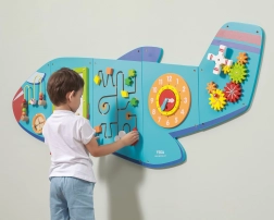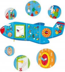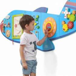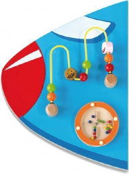 Trævægstavle Fly fra brandet VIGA er et multifunktionelt legetøj, bestående af fem dele, der tilsammen danner en flyform. Hvert element tilbyder en anden slags aktiviteter til sjov udvikling af børns færdigheder: