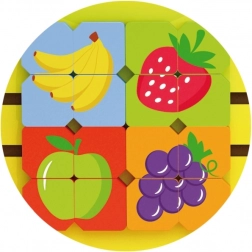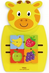 Brættet byder på puslespil, der viser forskellige frugter, som børn kan flytte og derved opdage forskellige former og farver.