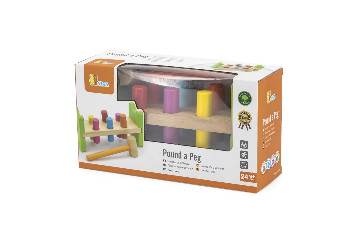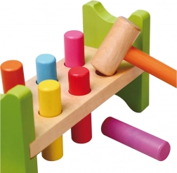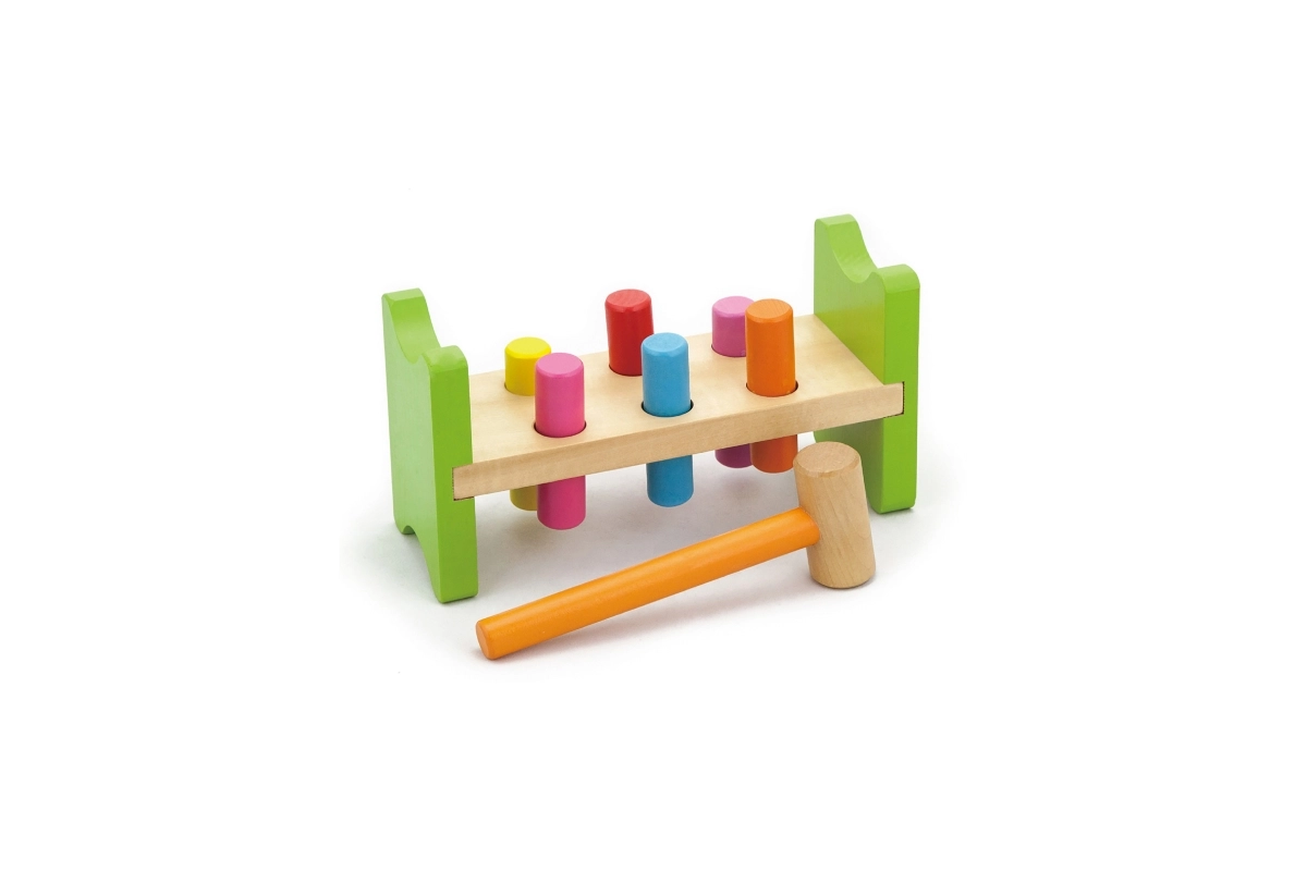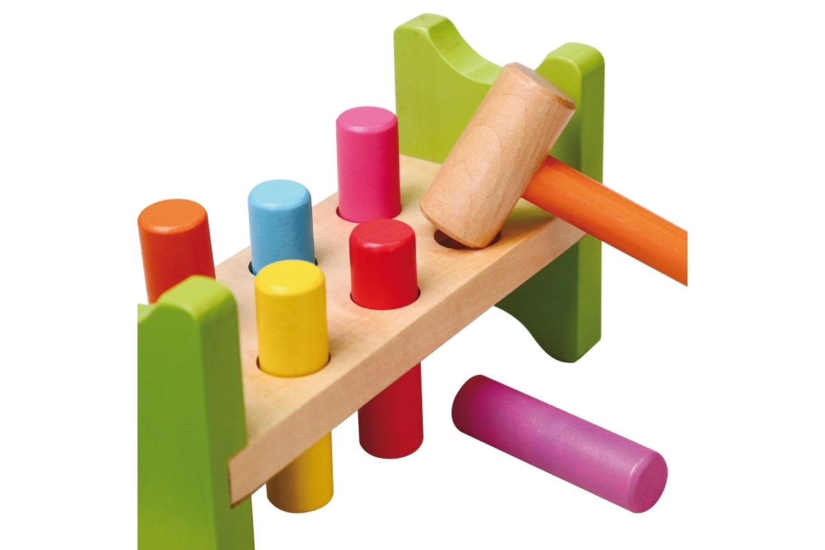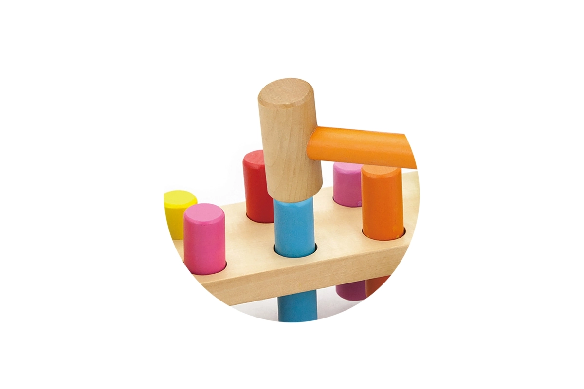 Denne træ-hammerbænk med mål ca. 22,5 × 12 × 7,7 cm giver børn timevis af meningsfuld leg. De farvede pinde bankes i med træhammeren, hvorved børn naturligt udvikler grebsstyrke, bevægelsespræcision og logisk tænkning. Den holdbare konstruktion og de glatte overflader sikrer sikker brug.