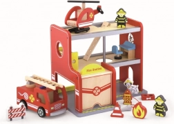 Denne detaljerede træ-brandstation giver børn et autentisk miljø til redningsmissioner. Med den røde station i flere niveauer, bil med stige og landingsplads til helikopter kan børn nemt skabe deres egne historier og træne koordination og logisk tænkning.