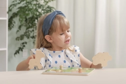 Opdag et sjovt træpuslespil med zoo-dyr, ideelt til de mindste. Store træknopper gør det nemt at håndtere, og under hver brik er der et hjælpebillede for korrekt placering. Legetøjet fremmer finmotorik, koordination og genkendelse af former og dyr og er et fremragende valg til børn fra 18 måneder.