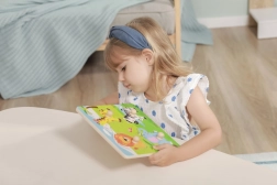 Under hver brik er der et billede, som gør det lettere at matche. Børn øver naturligt genkendelse af former og dyr.