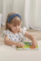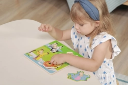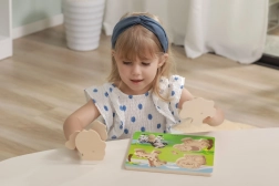 Den stabile træplade med fræsede kanter sikrer, at brikkerne sidder godt, og støtter samtidig formopfattelse, tålmodighed og logisk tænkning. Puslespillet er ideelt til den første læring om dyr og til sprogudvikling.