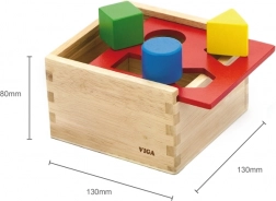 Børn lærer naturligt at skelne mellem former og farver ved at lægge de enkelte brikker i de matchende huller. Understøtter koordination og koncentration.