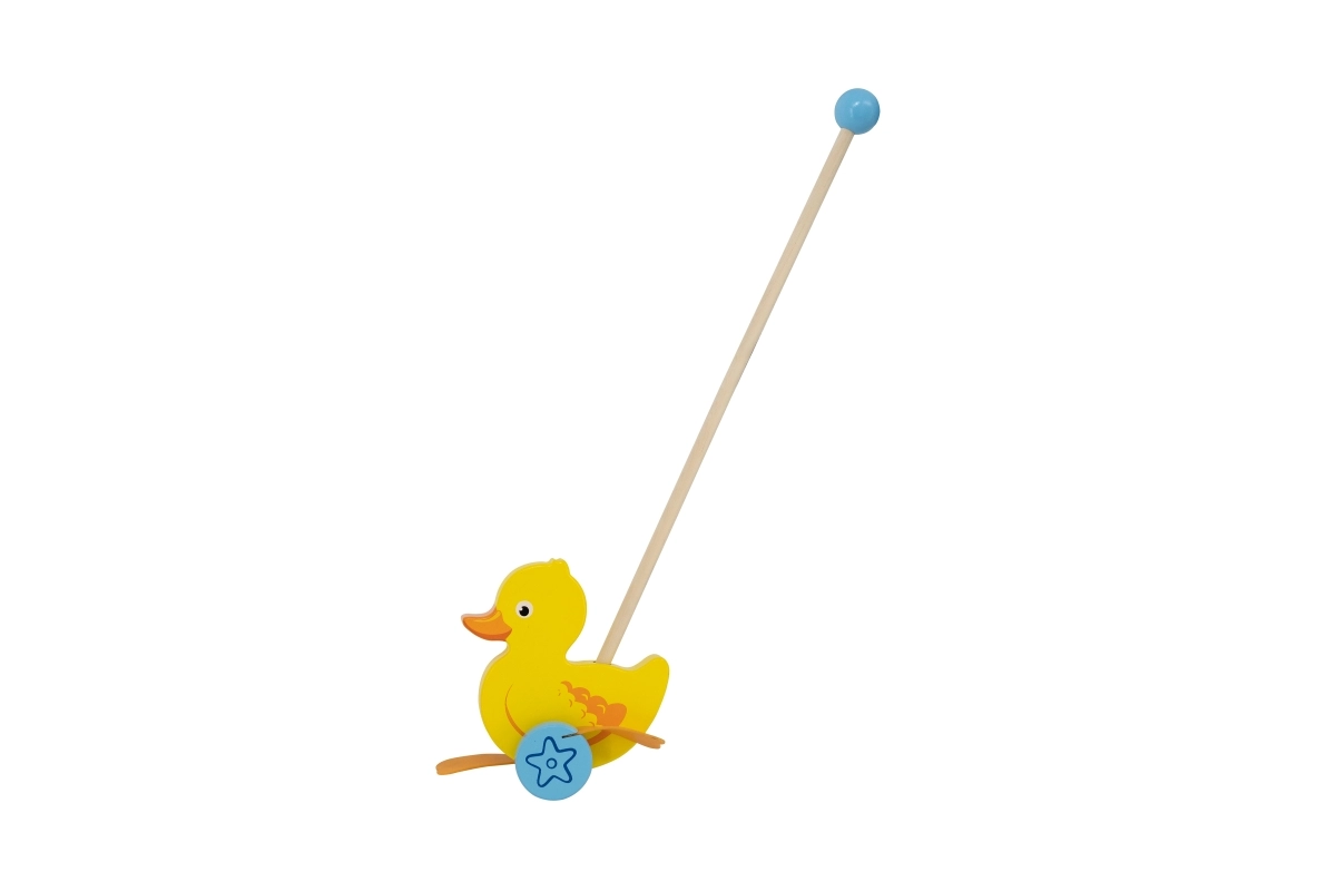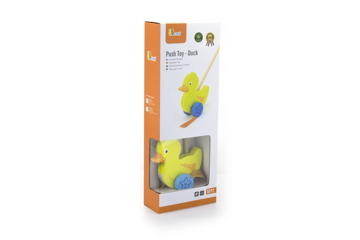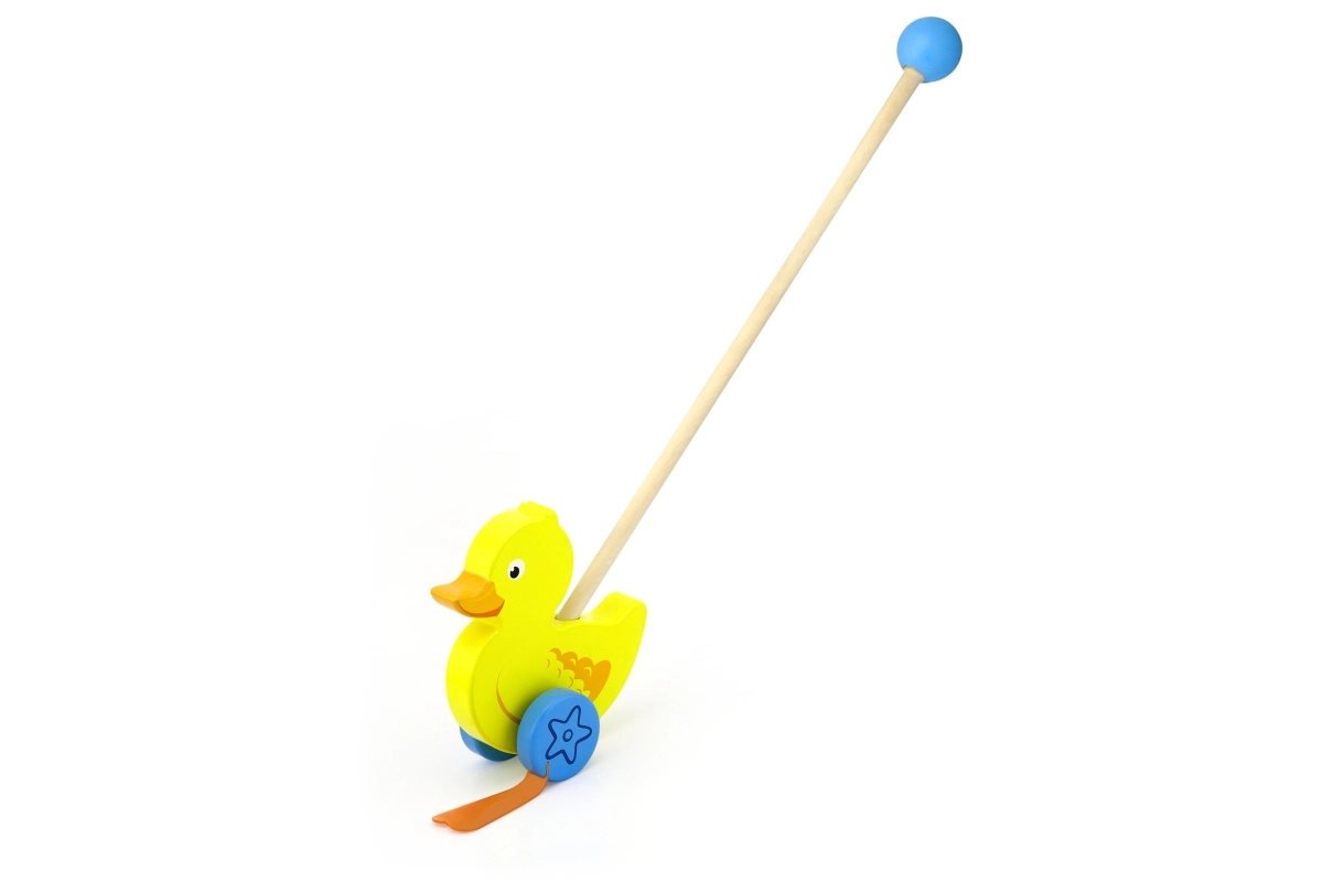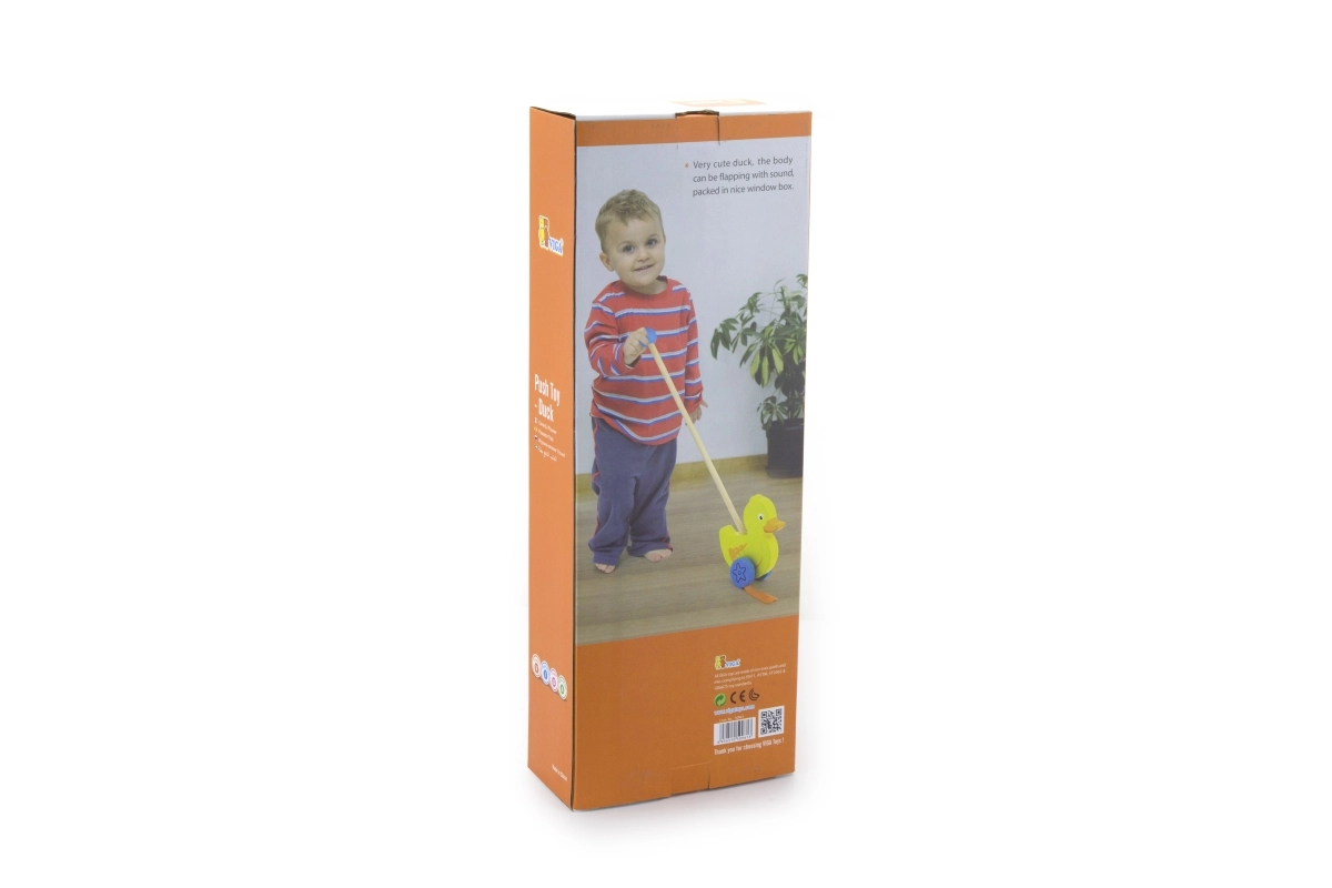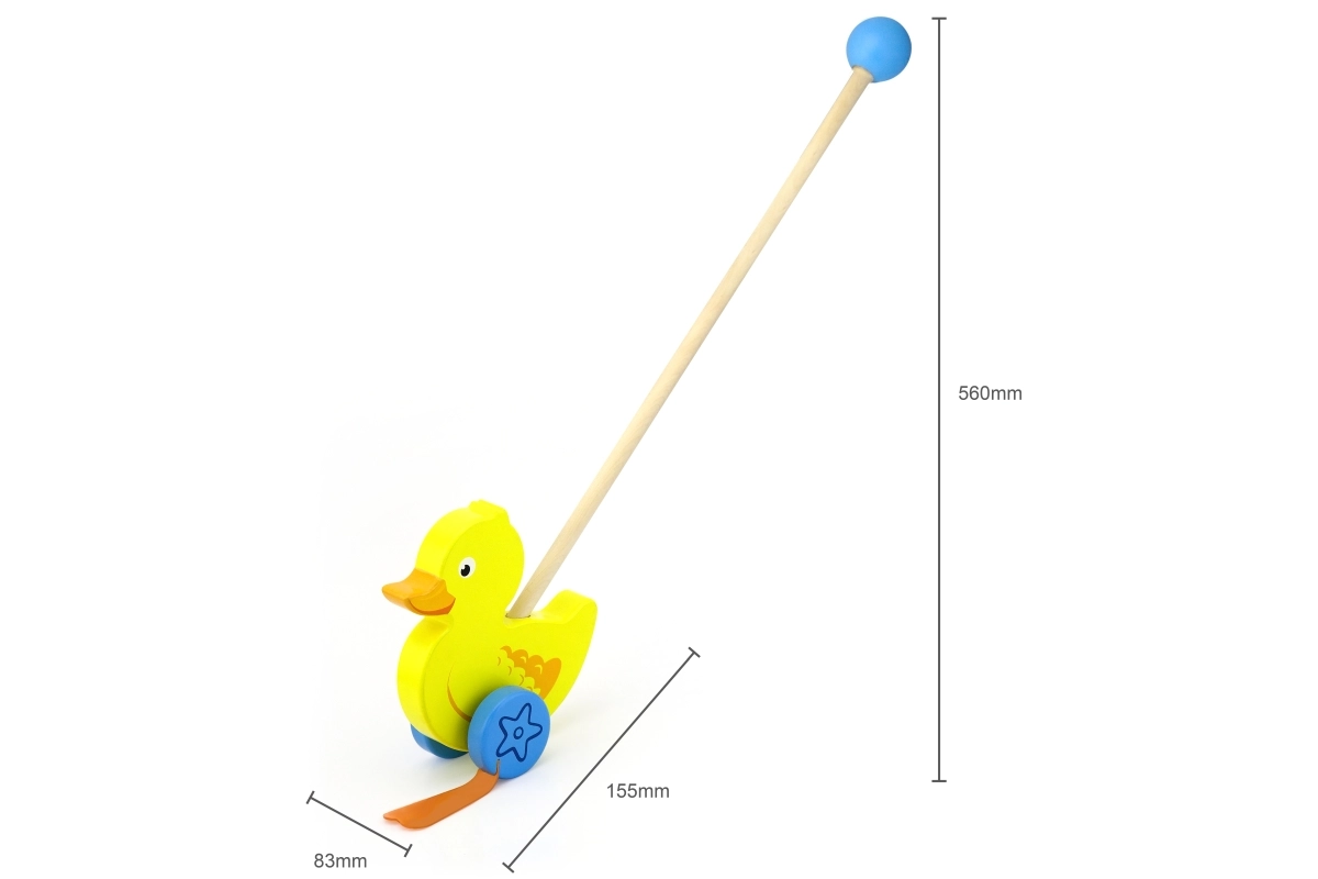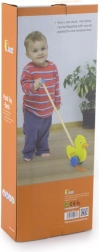 Træskubbe-and på en pind er et enkelt, men effektivt legetøj, som alle børn vil holde af. Det er et klassisk legetøj, der giver mange fordele. Den søde gule and bevæger energisk benene under kørsel, hvilket motiverer børn til at gå ture. Legetøjet er pakket i en pæn kasse med vindue, som gør det muligt at se anden. Indeni er der en pind med håndtag, der passer perfekt til barnets lille hånd. Pinden er ikke fastmonteret, hvilket gør den nem at opbevare. Hele legetøjet er lavet af bøgetræ og malet med giftfri maling i livlige farver, der tiltrækker opmærksomhed og opmuntrer til leg, hvilket giver masser af legeglæde.