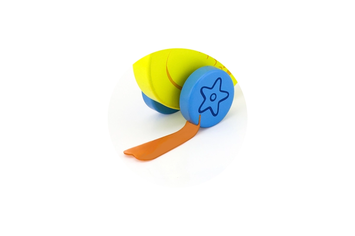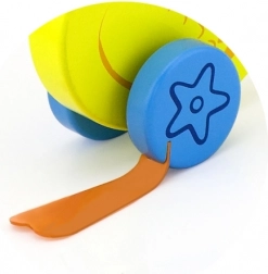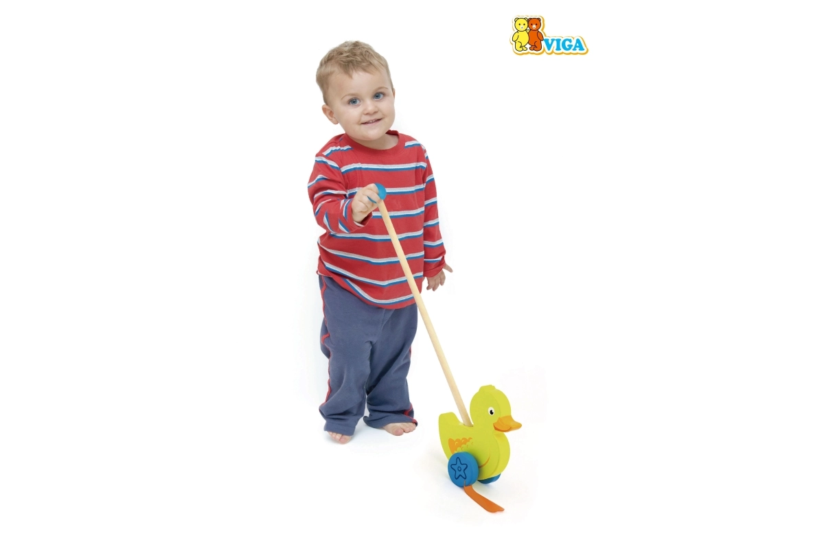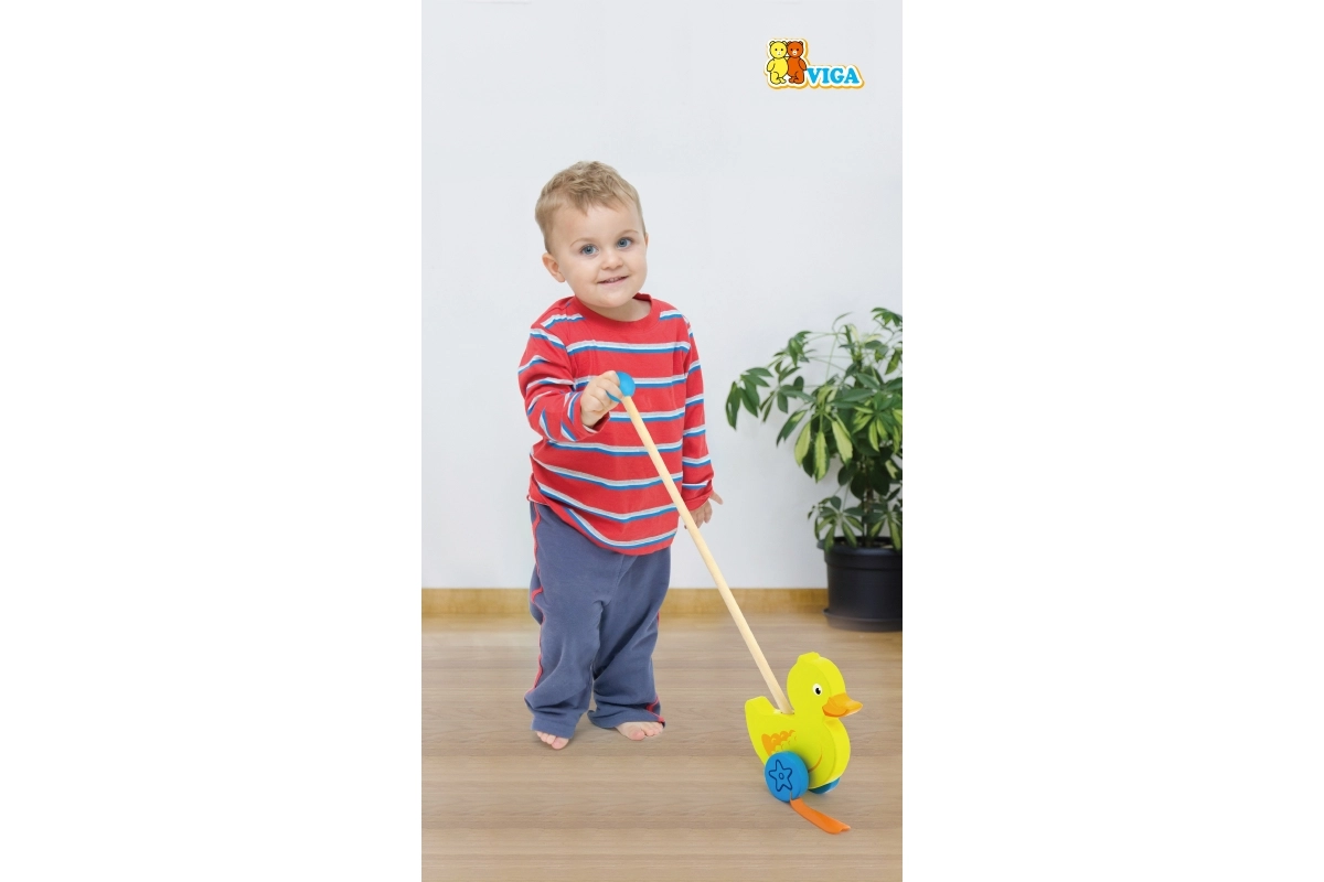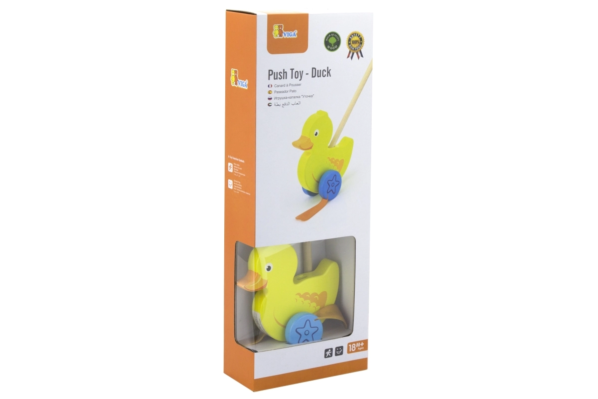 Træskubbe-and på en pind er et enkelt, men effektivt legetøj, som alle børn vil holde af. Det er et klassisk legetøj, der giver mange fordele. Den søde gule and bevæger energisk benene under kørsel, hvilket motiverer børn til at gå ture. Legetøjet er pakket i en pæn kasse med vindue, som gør det muligt at se anden. Indeni er der en pind med håndtag, der passer perfekt til barnets lille hånd. Pinden er ikke fastmonteret, hvilket gør den nem at opbevare. Hele legetøjet er lavet af bøgetræ og malet med giftfri maling i livlige farver, der tiltrækker opmærksomhed og opmuntrer til leg, hvilket giver masser af legeglæde.
