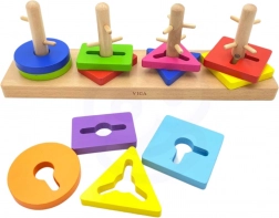 Vigas træ geometriske sorterings- og stablesæt giver børn sjov læring af nøglefærdigheder. Sættet består af fem pinde, hvor børnene placerer de tilhørende former; udfordringen er at matche formerne korrekt med de tilsvarende udskæringer. De klare farver tiltrækker og stimulerer de smås sanser.