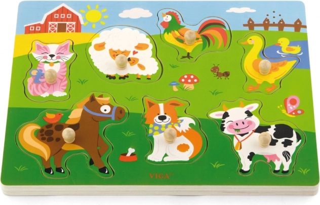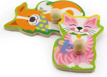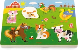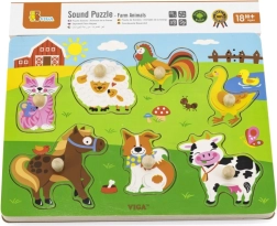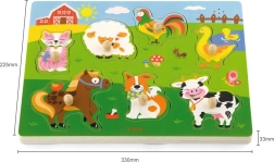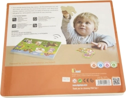 Træpuslespil med dyr med lyd. Når det rigtige dyr placeres, afspilles den lyd, dyret laver. Mål på pladen ca. 30 x 22,5 x 2 cm. Strømforsyning 2 x AAA-batterier (medfølger ikke). Pakkens mål ca. 30 x 27 x 2 cm. Alder 18 m+.