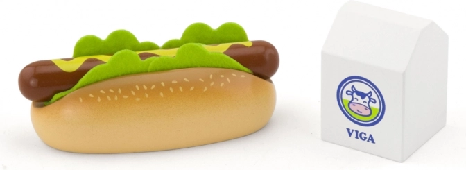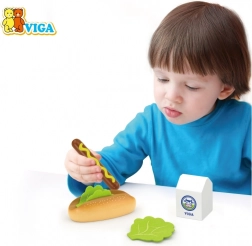 Dette kvalitets træsæt fra VIGA giver børn realistisk køkkenleg. Hotdog med brød, salat og sennep sammen med “mælkekarton” styrker kreativiteten og lærer børn grundlæggende social leg. Takket være den solide trækonstruktion er sættet ideelt til daglig leg.
