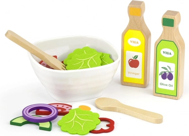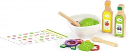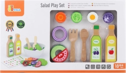 Dette kvalitets træsalatsæt bringer realistisk køkkensjov til børn. Takket være det rige indhold kan de små kokke lave deres egen salat, blande ingredienser i skålen og servere med bestik. Legen understøtter sunde vaner og lærer naturligt at genkende forskellige slags grøntsager.