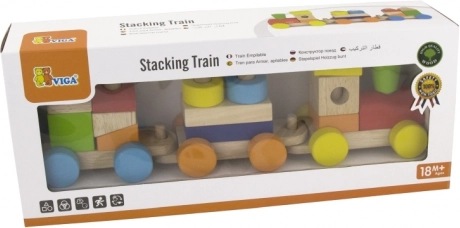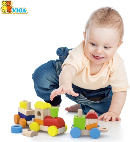 Opdag et tidløst trælegetøj, der forener leg og læring. VIGAs stablings-tog består af et lokomotiv og to vogne med farvede klodser, som kan omarrangeres efter behov. Børn øver hånd-øje-koordination, logisk tænkning samt genkendelse af farver og former.