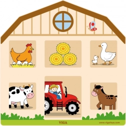 Denne kvalitets trælegeplade i form af et lille hus tilbyder flere døre med forskellige typer låse – kroge, hasper, kæder eller skydelåse. Ved hver åbning venter en lille overraskelse i form af illustrerede dyr, hvilket understøtter nysgerrighed, koncentration og øje–hånd-koordination.