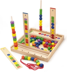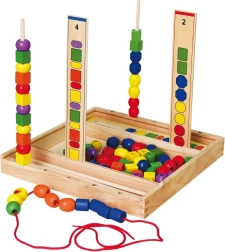 Børnene bygger og sætter perler på pinde i den rækkefølge, som kortene angiver. De træner øje–hånd-koordination, tålmodighed samt genkendelse af farver og former.