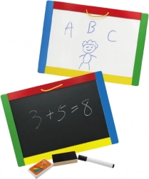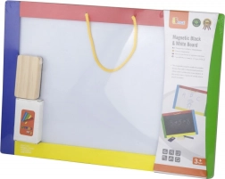 Denne alsidige tavle kombinerer to kreative flader i én – en sort magnetisk side til kridt og en hvid tør-sletbar side til tusch. Børn kan skrive, tegne og øve bogstaver og tal; på den sorte side kan de desuden nemt sætte magneter fast. I pakken finder du alt til øjeblikkelig brug: 4 styk kridt, en tør-sletbar tusch og en svamp.