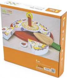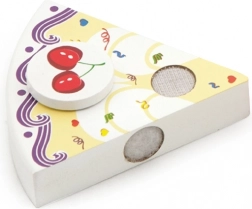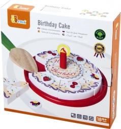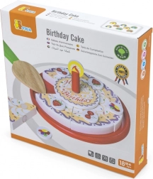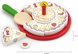 Den træ fødselsdagskage på en serveringsbakke er opdelt i enkelte stykker med dekorationer og et lys. Takket være velcro/magneter (afhængigt af version) kan delene nemt skilles ad og samles igen. Børn øver greb, præcision og ordforråd ved fælles “at puste lyset ud” og servering.