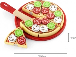 Sættet indeholder en pizza med en diameter på ca. 23 cm, en serveringsbakke og en spartel/kniv til realistisk udskæring. Med de aftagelige toppings træner børn greb og fantasi, mens forældre sætter pris på nem vedligeholdelse og træets lange levetid.