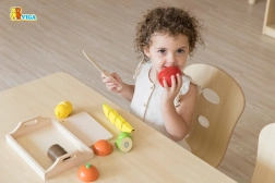 Takket være velcro kan frugten skæres og samles igen med en enkelt bevægelse, hvilket fremmer udviklingen af finmotorik.